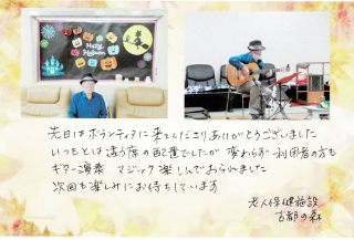 | 2025.5.15 老人保健施設”古都の森”(No250) |  今回はスタートが先方の事情で20分ほど遅れた。そのためマジックは予定通り終えられたが、ギター演奏の途中で3時を過ぎてしまい、それでも後1曲演奏した。で、14曲予定が10曲になった。普通は2時50分くらいで終えるので、ちょっとやり過ぎたかも。 前回とは違い音響設備に問題はなかった。 | 花、瀬戸の花嫁、ジンギスカン、忘れな草をあなたに、コーヒールンバ」、アンパンマンのマーチ 他 | ||||||||||||||||||||||||||||||