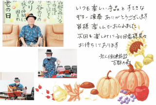 | 2015.9.29 中仙道デイサービスセンター | ホームページで紹介頂きました。ありがとうございます。  | 手のひらを太陽に 小さい秋みつけた ビリーブ 禁じられた遊び となりのトトロ <アンコール> おどるポンポコリン | ||||||||||||||||||||||||||||||
